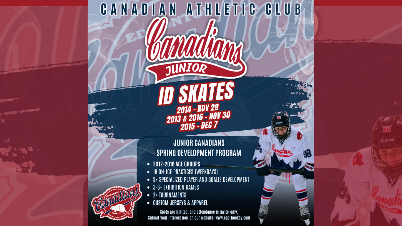 The Canadian Athletic Club is excited to invite elite players born 2012-2016 to showcase their skills at our Junior Canadians Spring ID Skates, the next skates will be for 2013, 2014, and 2016 born players on November 30 and 2015 born players on Dec 7 .