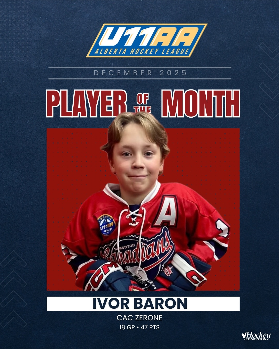 Ivor Baron had an exceptional December with the U11 AA CAC Zerone team, earning both Star of the Month recognition and the prestigious Hockey Edmonton Player of the Month honour.